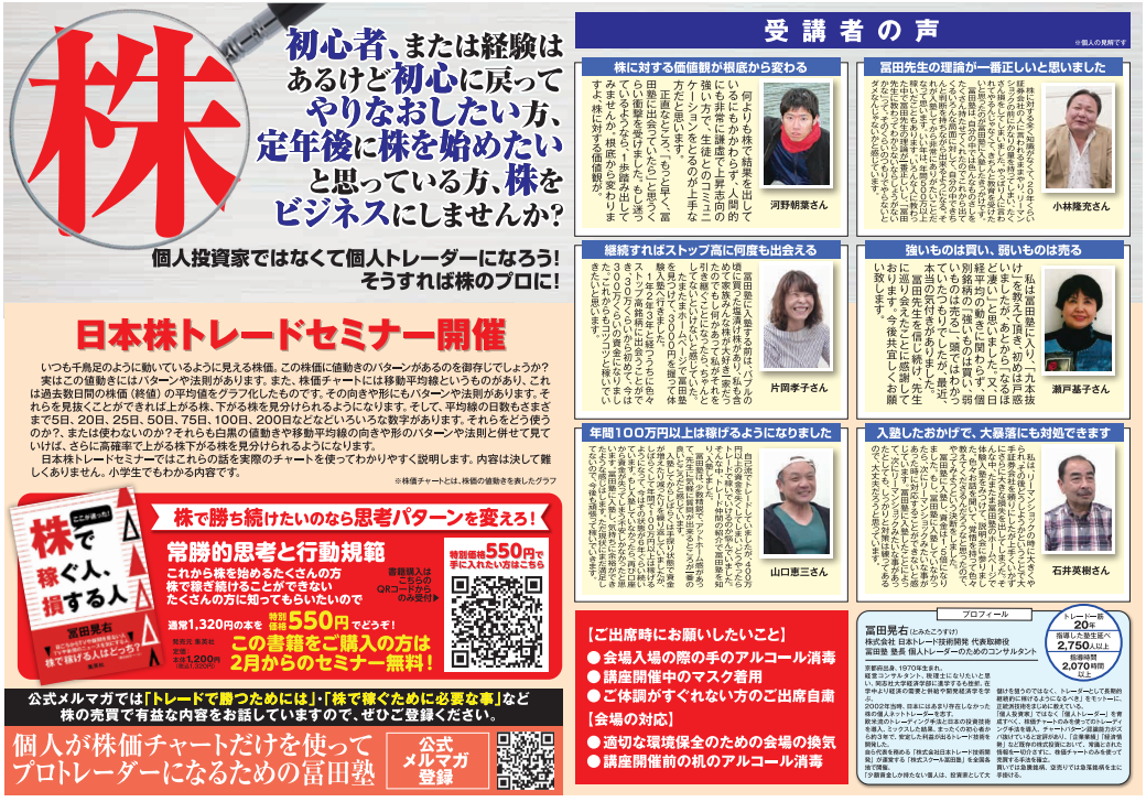 株式スクール冨田塾は、本気で株で成功したい個人トレーダーのために、株で長期的継続的に稼げるトレード技術を日本一手厚く伝授します。体験セミナー開催中!